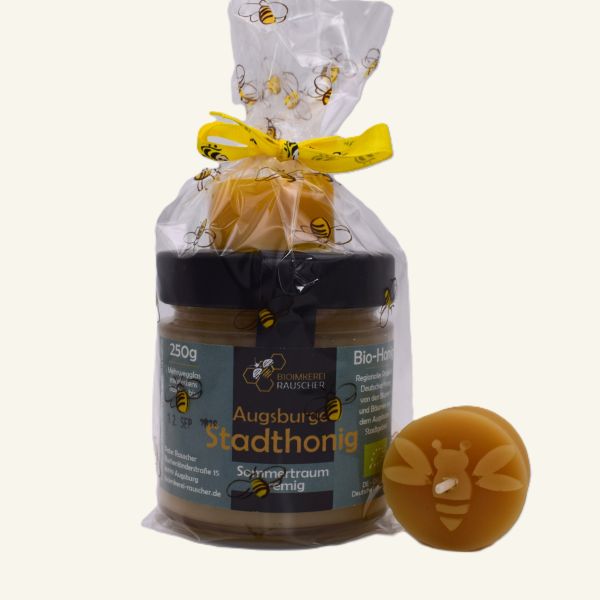 Das Set enthält feinen Honig aus Augsburg und eine handgegossene Bienenwachskerze, verpackt mit Sorgfalt und Herz.